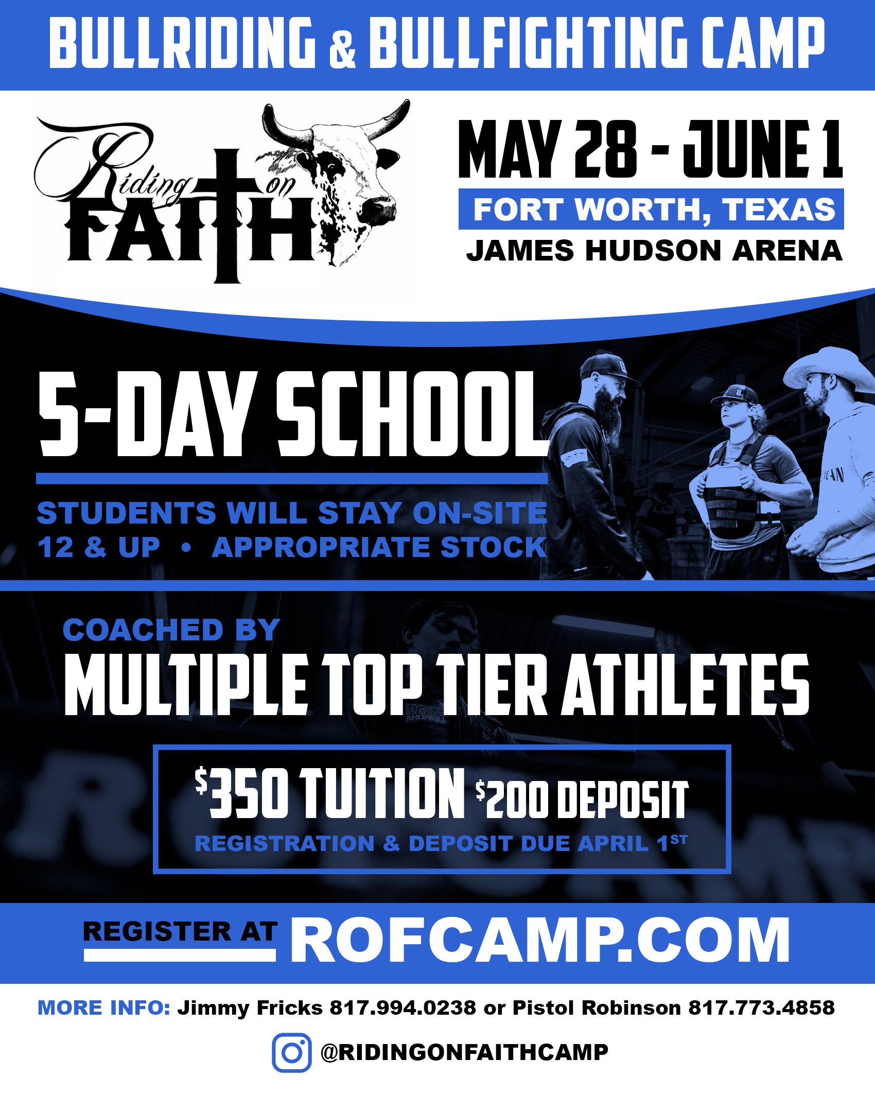 Camps are a unique blend of biblical teaching and rodeo instruction geared towards encouraging our youth to deepen their personal relationships with Jesus Christ. We offer both bull riding and cowboy protection camps coached by multiple top tier athletes.
